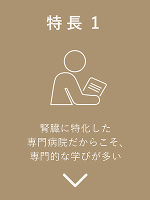 腎臓を診ることは全身を診ること”働く一人ひとりが知識や技術の向上に努め、チーム内の勉強会はもちろん、職種横断型の学びの場も設けるなど、自己スキルを高められる環境が整っています。